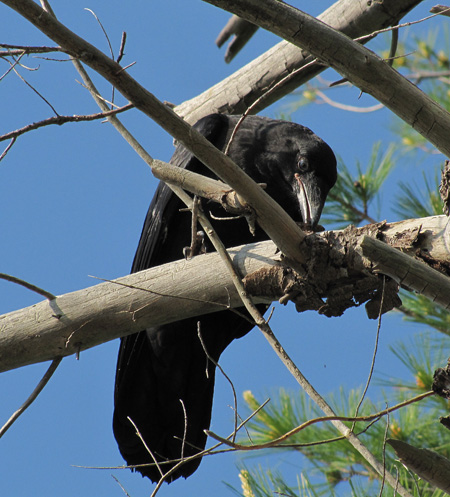 The raven is a personal favourite of mine. Steeped in lore amongst cultures around the globe, they are perhaps the most intelligent of all bird species and their remarkable behaviours can be witnessed throughout the year. A group of recently fledged Common Ravens (Corvus corax) were discovered in a stand of pine on the west side of Clearwater Lake last week. There was no sign of a nest in the treetops but there was a steep cliff on the opposite side of the lake, which may have supported a nesting pair. The youngsters were quite entertaining to watch and they allowed my approach for some decent photos and a better view. In between bouts of raucous calls and chatter to its siblings, this one concentrated on deftly breaking off and strutting around with twigs.