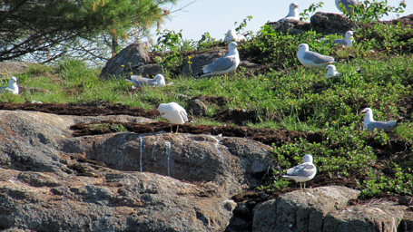 Surprisingly, neither Herring Gull (Larus argentatus) or Ring-billed Gull (Larus delawarensis) are listed as species having bred in Frontenac Provincial Park. This may be an unintended omission in my source material as suitable habitat exists on many of the larger perimeter and interior lakes. Both species were found tending nests this morning on a small rocky island with a few large eastern white pines. There were enough nesting pairs to label this a colony. I only had time for a quick paddle by this morning but will return soon to accurately census the colony. I must remember to bring some sort of decoy to avoid getting hit by marauding Herring Gulls. I’m not too keen on the idea of capsizing the canoe in a cold lake that is 73 metres deep!