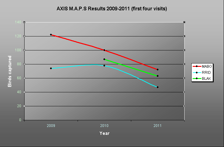 Here is a quick chart that describes an apparent decline of the adult population at all three stations since 2009 (Only 2010-2011 for BLAK). The graph was generated using total captures (newly banded birds and recaptures) for visits 1-4 by year and station. It would be such a tremendous resource if we had more MAPS stations across Ontario to facilitate local and regional comparisons of vital rates. Unfortunately, in marked contrast to the United States, participation in Canada and in Ontario has been very low. The development of a coordinated and standardized effort to monitor breeding bird demographics in the province would be a major asset for biologists to detect and understand forces affecting landbird populations – now more than ever with advancing climate change.
