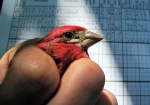 The BLAK station was the “winner” of Round 3 as 25 birds (20 new, 5 recaptures) were captured here during the visit. All five recaptures were of birds banded earlier in the 2011 season. We banded a nice variety of species, including another male Black-throated Blue Warbler, a Yellow-rumped Warbler and a Hermit Thrush. The highlight though was the male Purple Finch extracted from net 7 around mid-morning – another first for our MAPS program! This species does occur regularly at all three stations but are so strictly attached to the upper canopy that they will always be only rarely captured.