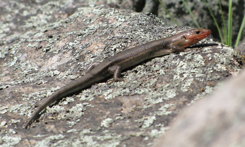 So strange to find a lizard in Ontario but they’re definitely here. Yesterday around noon, I found this adult male in a rocky outcrop laden with deadfall and thorn scrub. The Five-lined Skink is Ontario’s only native lizard species. They occur in two areas; the Carolinian region and along the Southern Shield ecotone. The two populations are genetically isolated and have differing habitat associations. The Southern Shield population favours rocky areas while the Carolinian version prefers sandy habitats. The Carolinian population, listed as Endangered, is small and restricted to just a few sites in southwestern Ontario. Five-lined Skinks of the shield are considered more numerous although relatively little is known about their ecology and abundance. The shield population is listed as a Species at Risk with a status of Special Concern. More information on this remarkable species can be found here.