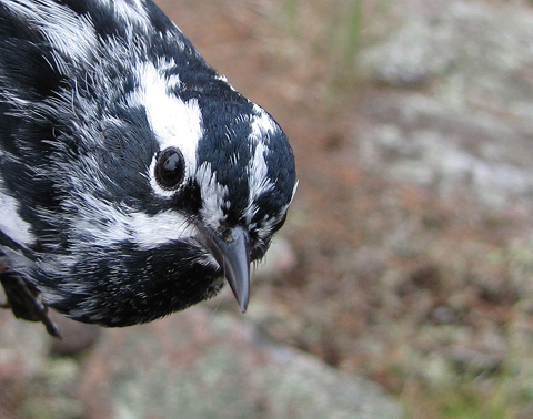 Normally I pull the plug on any planned M.A.P.S visit when the forecast indicates a 50/50 or greater chance of precipitation – too risky for me. However, I had little choice with visit 2 to Rock Ridge (RRID) on June 17. There was a brief 30 minute shower near dawn, which delayed net opening, but the rest of the morning was generally just damp and cloudy. We closed slightly early due to the forecast late morning thunderstorms – don’t want to be caught in that when a couple of kilometres out on Big Clear Lake. We noted much more bird song and chatter on this visit compared to our first but it seemed that the dreary weather was limiting bird activity. We ended the abbreviated visit with just 7 captures but left feeling encouraged by the apparent increase in numbers of expected species, particularly Black-and-white Warblers and Eastern Towhees. We caught an Ovenbird, which was weird for rock barren habitat. Even more surprising was the Prairie Warbler that sang from two positions at opposite ends of the study area throughout the morning. I’ve already picked out his colour bands so hopefully he will be there when we return….